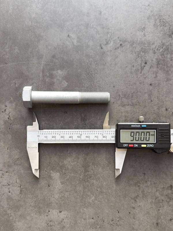 Болт с шестигранной головкой. Стандарт: таблица FIAT-ВАЗ 10312. Заводской номер : 00001-0055415-31. Длина болта: 90 мм. Диаметр резьбы: 12 мм. Шаг резьбы: 1,25 (мелкий). Длина резьбы: 30 мм. Размер "под ключ": 19 мм. Класс прочности: 10.9. Покрытие: цинк-ламель. В соответствии со стандартами, длина болта измеряется от опорной части головки до конца фаски, которой завершается его резьбовой стержень.