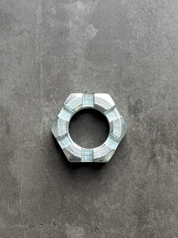 Гайка М24х1,5 корончатая, мелкий шаг резьбы. Гайка российского производства. Артикул: 853514. Применяемость: гайка рулевого пальца КАМАЗ. Диаметр резьбы: 24 мм. Шаг резьбы: 1,5. Высота: 20 мм. Размер "под ключ": 36 мм. Высота от опорной поверхности до основания прорези: 14 мм. Покрытие: цинк.